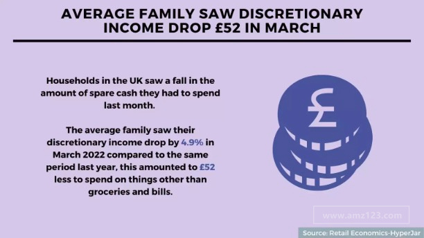 3月份英国家庭平均可支配收入有所下降,同比下降了4.9%,用于购买杂货和支付账单以外的的支出减少了52英镑。研究显示,家庭可支配支出的损失可能会在整个月内抹去约14亿英镑的非必需品销售额。