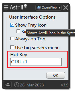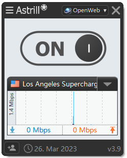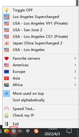 默认使用软件时,在打开和关闭代理,都是鼠标左键点击通知区域软件五角星图标,弹出Astrill对话框,然后点击ON/OFF按钮。