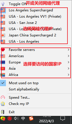 1). 可以不用打开Astrill软件对话框,想打开或者关闭网络代理,直接鼠标移到通知区域的五角星图标,然后点击鼠标右键,如下图所示: