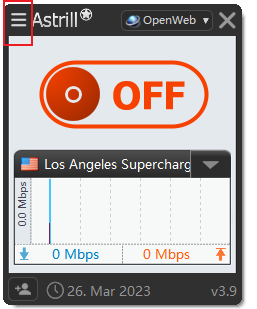 2).第二种方法,在软件中设置,打开Astrill软件对话框,点击左上角,如图所示: