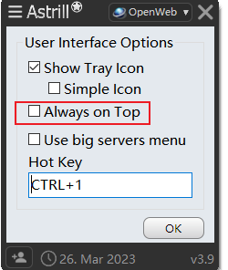将默认选中的"Always on Top"前面的勾去掉,这时软件使用时就不会置顶。不置顶的话,配合快捷键(热键)使用,非常高效和方便。