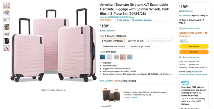 在过去的三个月里,这套American Tourister行李箱的收入增长了近7000%,尽管如此,该品类的关键词搜索记录也揭示了消费者成本意识的增加。这个ASIN的首要关键词是 "清仓行李箱组合",并在过去30天里,搜索量增加了110%。