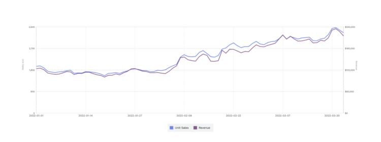 比基尼的销售量也直线上升,超过了去年春假季节前的销售量,超过了300%。在过去6个月中,该类别中排名前25位的每一个产品的收入都增加了100%或更多。