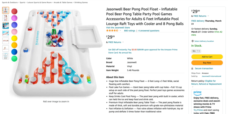 春假是以往美国大学生出游最密集的一个假期。今年,许多大学生消费者又开始了春假旅行。亚马逊上一些相关商品的收入和销售的增加,也是发出了大学春假出游回归的信号。例如,这个啤酒杯泳池漂浮床的收入在过去一个月里增长了200%以上。