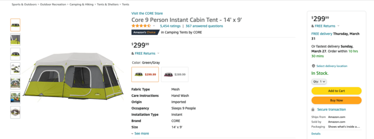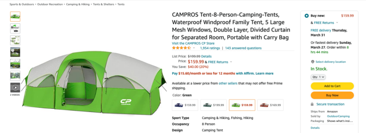 然而,这款售价为159.99美元的8人CAMPROS帐篷在6个月内收入增长了100%以上。更高的性价比可能是这两个相似的商品却有着截然不同转换率的关键因素。