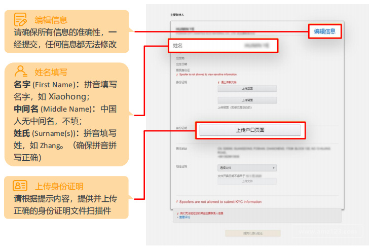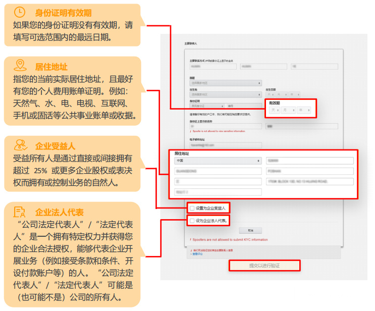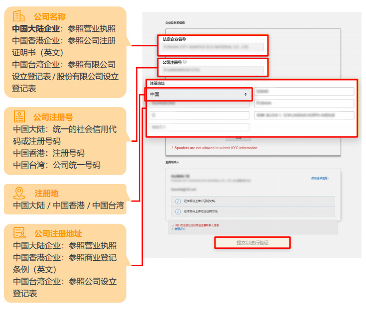 2)进入受益所有人编辑页面后,请参考主要联系填写指南,准确填写至无空白栏后,方可点击"提交以进行验证"按钮。