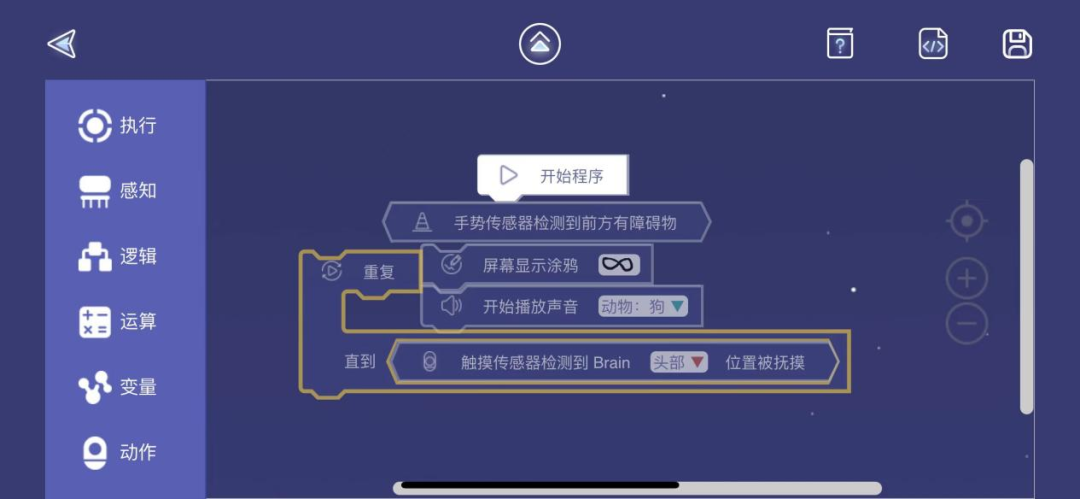 另一种玩法是图形化编程。在 ClicBot 的 App 内设置了"执行"、"感知"、"逻辑"等几组程序,每一组程序都是用一种图像表示出来的,不像程序员用电脑写编程那么复杂,玩家只需要按自己的意愿把图像拖进操作区内然后点击保存,这套程序就可以在自己的机器人身上执行了。
