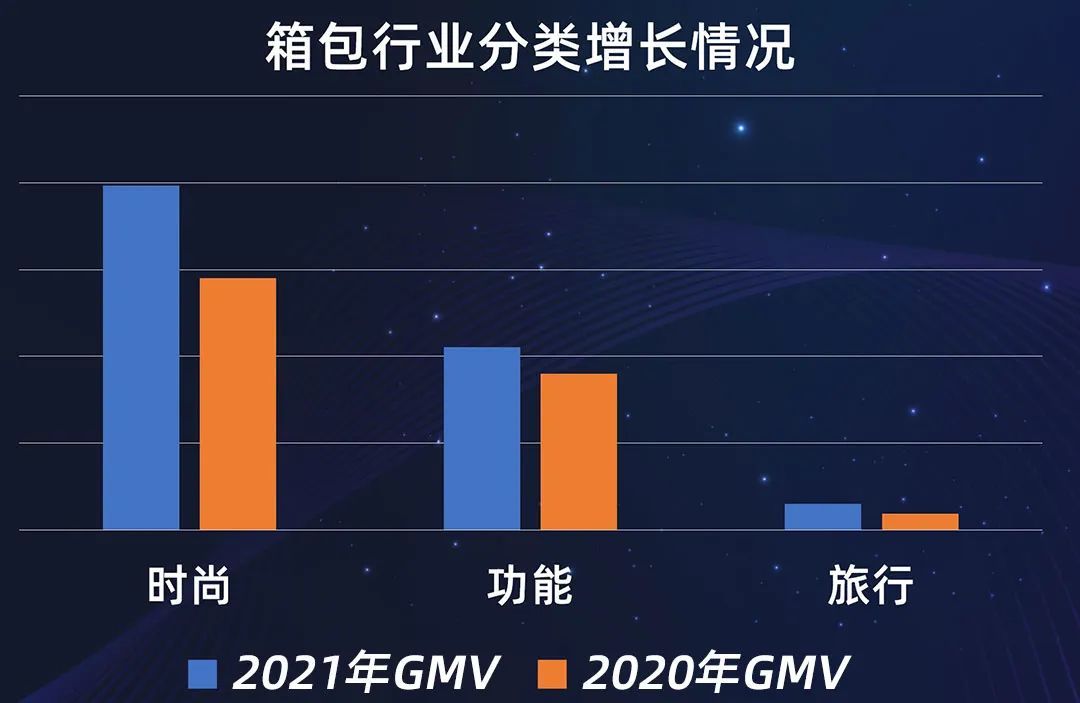箱包行业按照品类可分为时尚箱包、功能箱包、旅行箱包。2021年时尚箱包领涨占比60%;旅行箱包低基数高增长,虽受疫情影响较大,但仍呈现企稳向好势头。