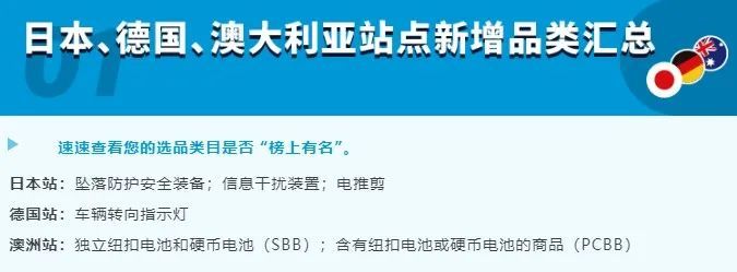 亚马逊日本/德国/澳大利亚站更新新增品类合规政策近日,亚马逊发文称,亚马逊日本、德国、澳大利亚站更新了新增品类的合规政策。卖家朋友们需要根据上述地区的法律法规及亚马逊政策,在上架产品时严格遵守相关要求。如果卖家所售产品涉及相关国家的相关产品,需要及时准备相关合规证明文件并进行合规操作。