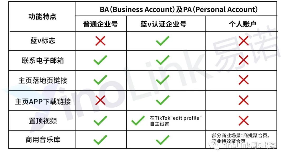 下表是TikTok企业号、蓝v认证后的企业号以及个人账户具体可用功能对比。