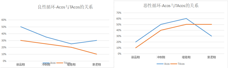 其实一般情况下推广新品的时候整体广告花费占比(TAcos)和广告投入产出比(Acos)主要分为两种,一种为良性循环,一种为恶性循环,如下图: