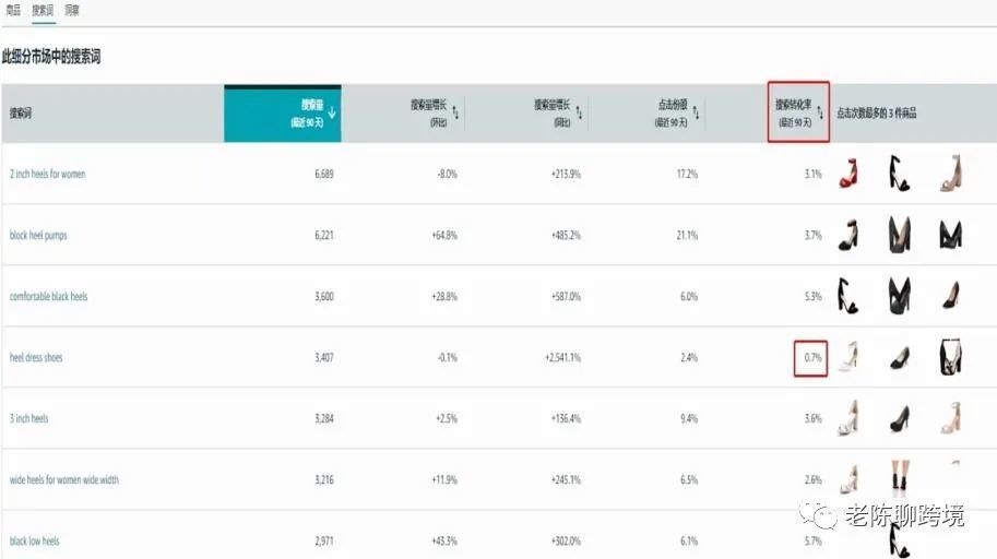 亚马逊后台是这样解释的:在买家输入该搜索词,并点击此细分市场中的任意商品后,商品购买次数占买家输入该搜索词总次数的比例,时间范围为最近90天。