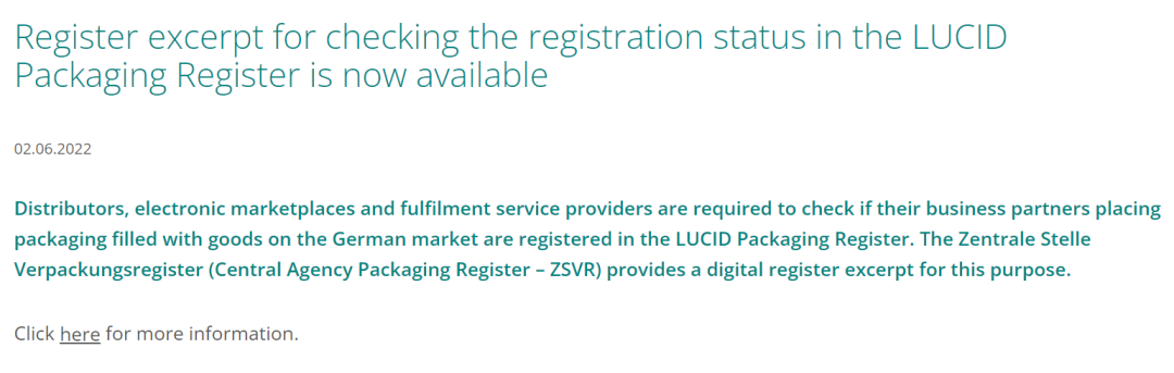 另外,6月初LUCID官网也向电商平台、履约服务商等开放注册摘录,以方便他们验证其卖家与客户的注册状态。对于跨境电商卖家来说,这就意味着这些电商平台、履约服务商都能查到卖家们的包装申报基本情况,包括向哪些回收公司申报,申报的包装数量等信息。