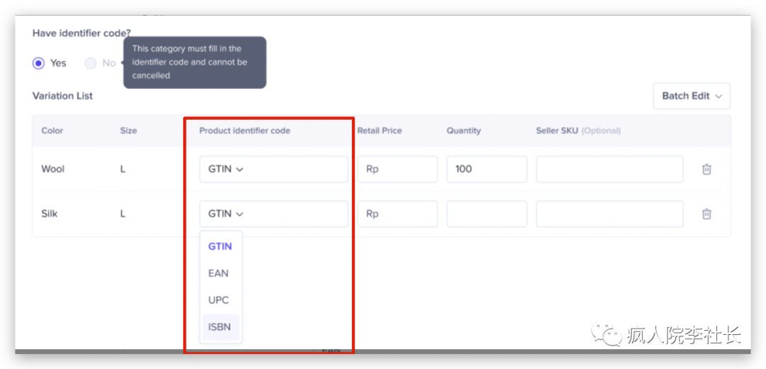 6月底,我们在小店上传商品的时候,销售属性一栏就会多出来一个GTIN码的下拉选项: