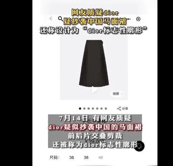 据了解,7月14日,有网友质疑dior疑似抄袭中国的马面裙,前后片交叠剪裁,却被称为"dior标志性廓形"。