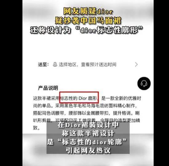 而在中国马面裙的设计中,一般为两片式,前后光面,左右打褶,是一种罕见而典型的形制,少在其他裙装设计中见到。在dior裙装设计中,称这款半裙设计是"标志性的dior轮廓",引发网友热议。
