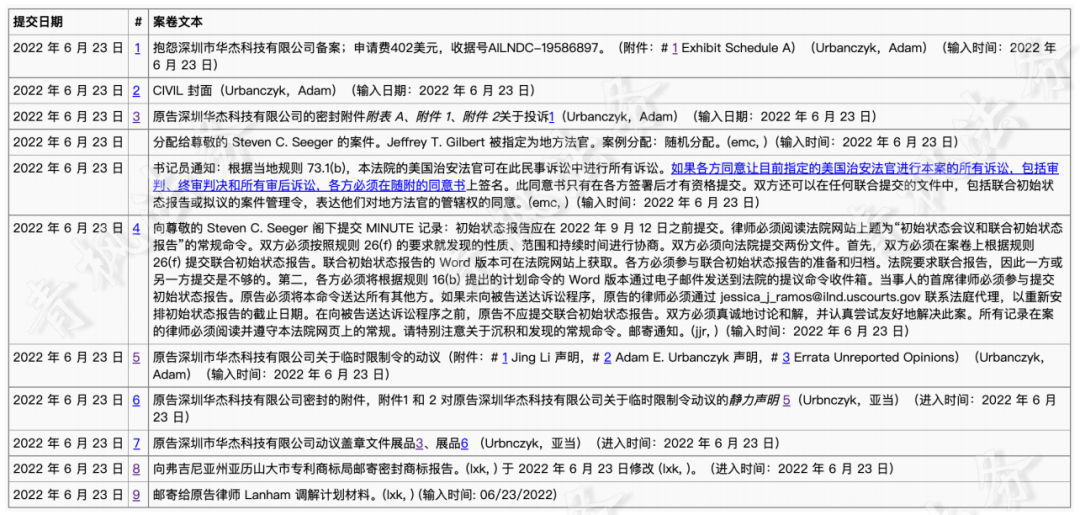 起诉时间:6月23日案件号:22-cv-3277代理律所:AU LLC受理法院:伊利诺伊州北区法院原告公司:Shenzhen Huajie Technology Co Ltd