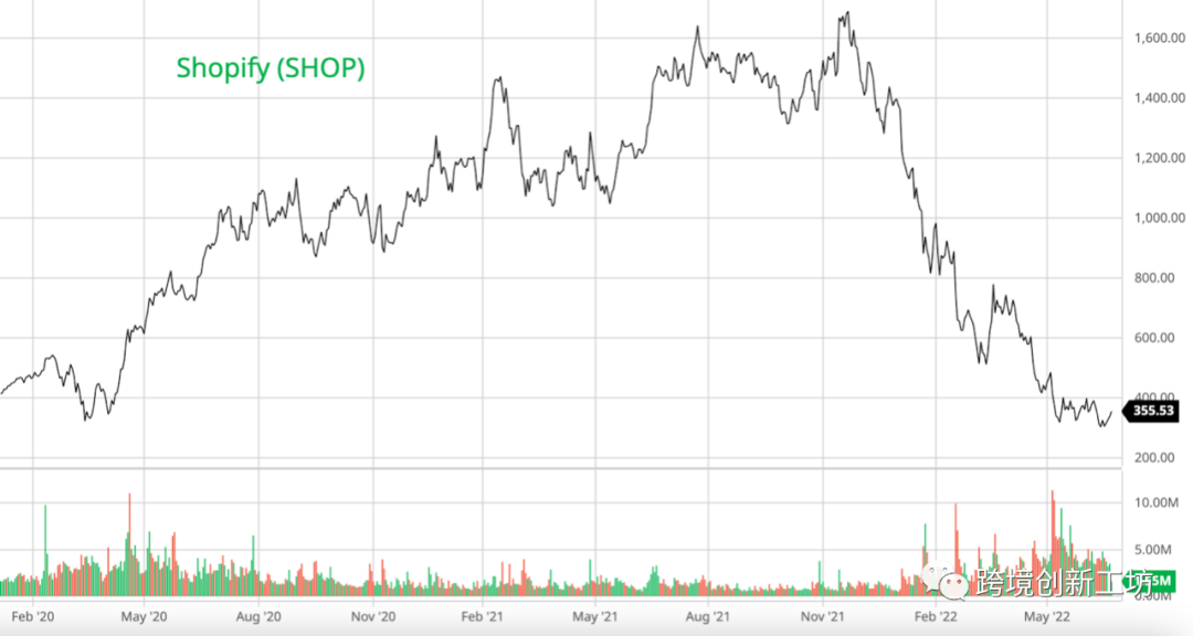 从下面的shopify股价趋势图,你会看到令人担忧的景象。自2021年底达到疫情以来的最高点(每股超过1600美元)以来,股价已经下跌达80%,已恢复到大流行前的水平,形成了可怕的倒抛物线。