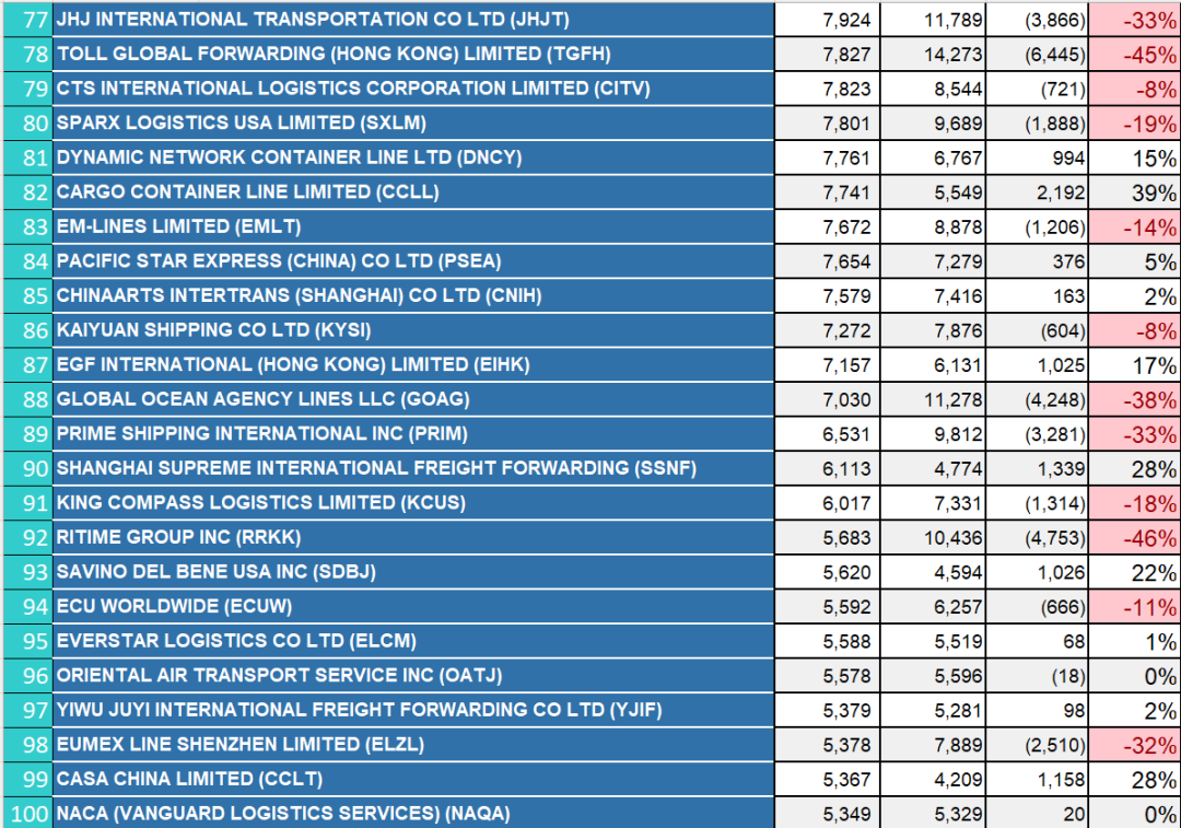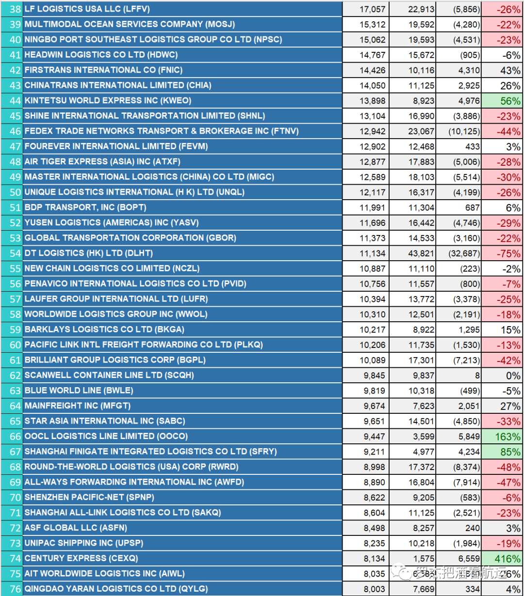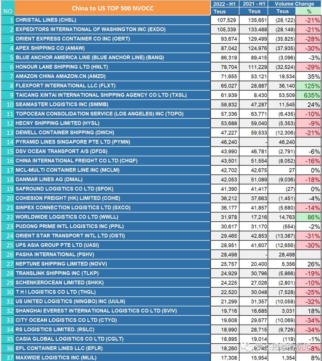 中国出口美国,2022年上半年(按到港日)和去年同期的货量对比,以2022年的货量排名。