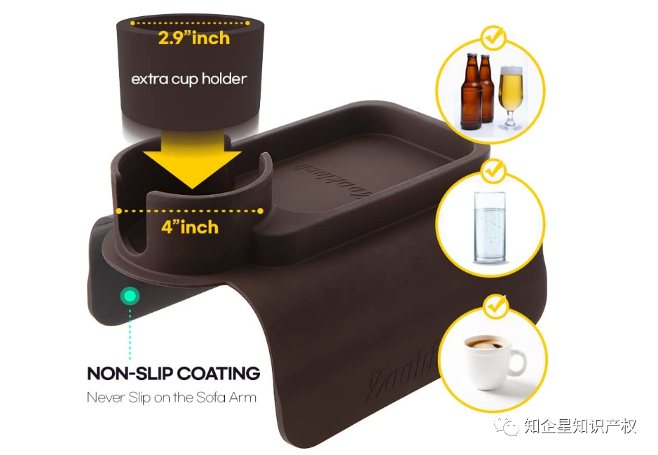 杜绝专利侵权风险,为您的产品保驾护航!今天分享一款硅胶沙发杯托,它是美亚站的Amazon'sChoice,售价39.9美金,留评363颗星。