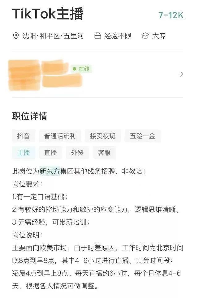 据知情人士透露,新东方招聘TikTok 主播,主要面向欧美市场。"工作时间为北京时间晚8点到早8点,每天直播约4-6小时,每个月休息4-6天"。
