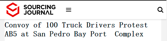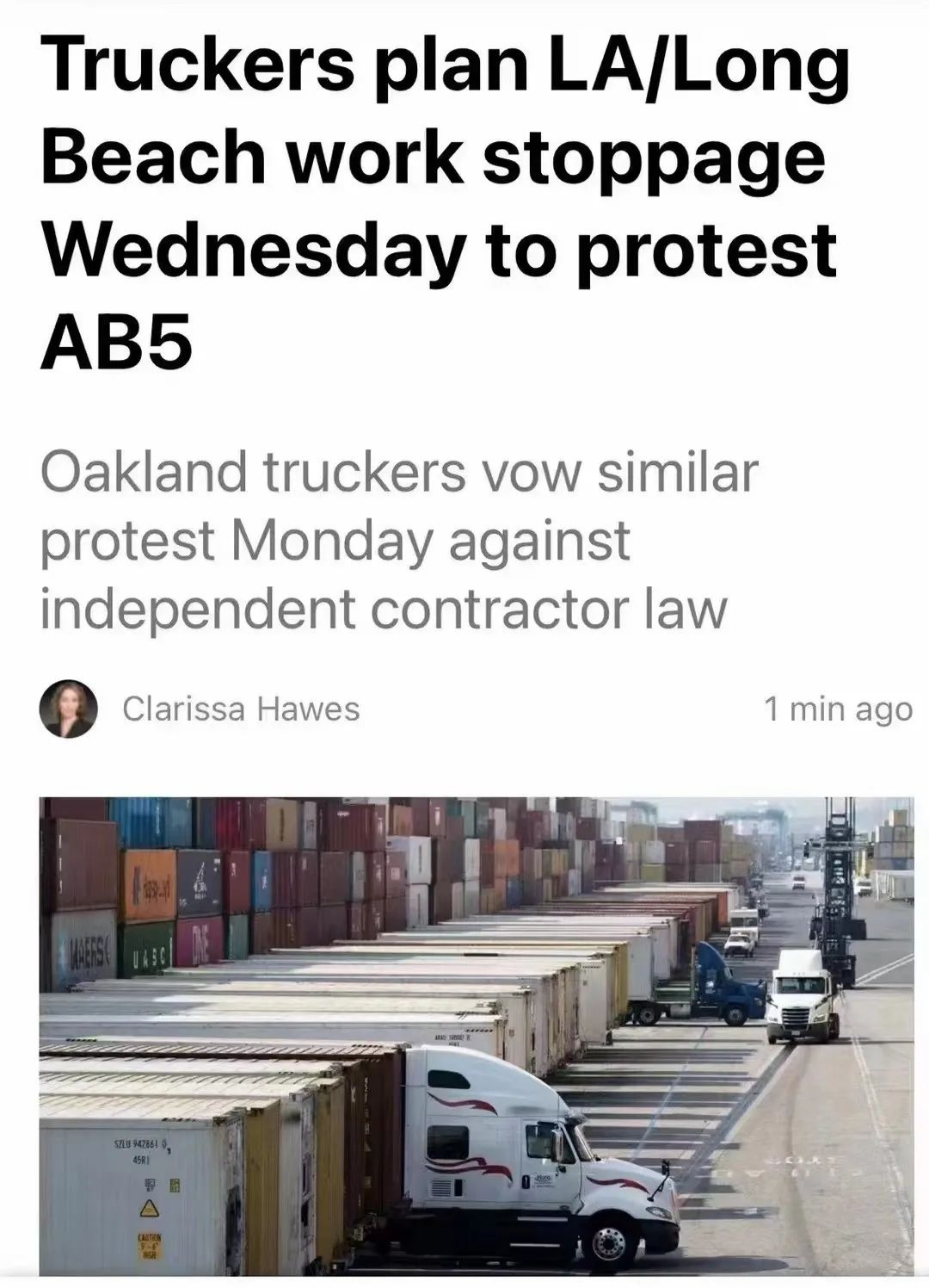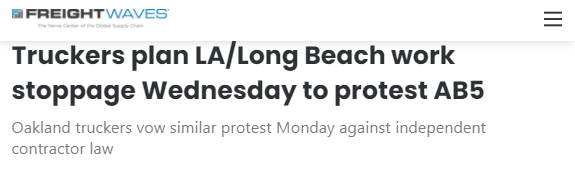 此前,据美国媒体报道,一些在洛杉矶/长滩港的海运码头运输集装箱的卡车司机反映,他们计划参加周三的罢工,以抗议一项有争议的州法律AB5。该立法寻求将许多独立承包商模式司机重新归类为雇员模式。