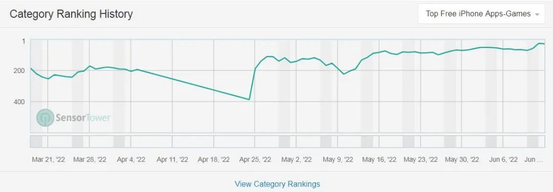 而笔者最近观察到一个来自阿联酋的游戏厂商 Azur Games,这家公司在最近也对 SLG 做了"精简",其发行的「State.io-Conquer the World」(以下简称 State.io)操作极简化。游戏在 2021 年 3 月下旬正式上线,从 2022 年 4 月下旬开始排名迅速增长。Azur Games 随后又从 5 月 31 日起进一步加大了「State.io」的营销和活动投放力度,于 6 月 12 日在 Sensor Tower 美国市场 iOS 免费手游榜中跻身第 25 位,刷新最高排名记录。
