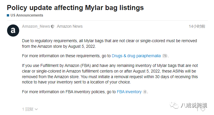 有卖家朋友重新分析公告内容:"主语是mylar bags that are not clear or single-colored, 标题是mylar bag listings。我的理解是mylar bag作为商品售卖的,而不是用mylar bag.............