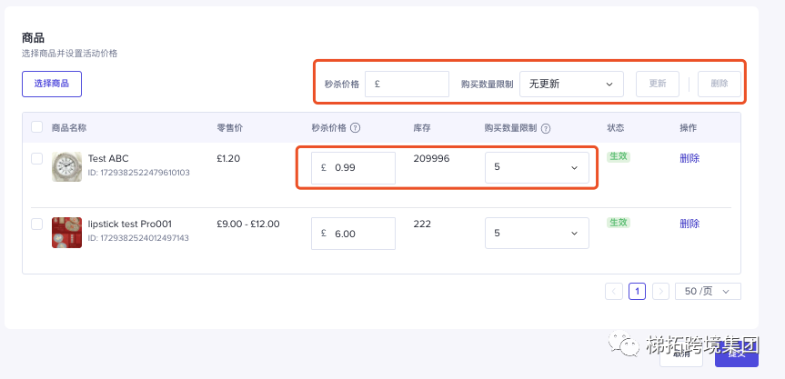 批量商品设置:选择产品,填写"秒杀价格",选择"购买数量限制",点击"更新"应用至所选商品/点击"删除"删除所选商品,点击"提交"
