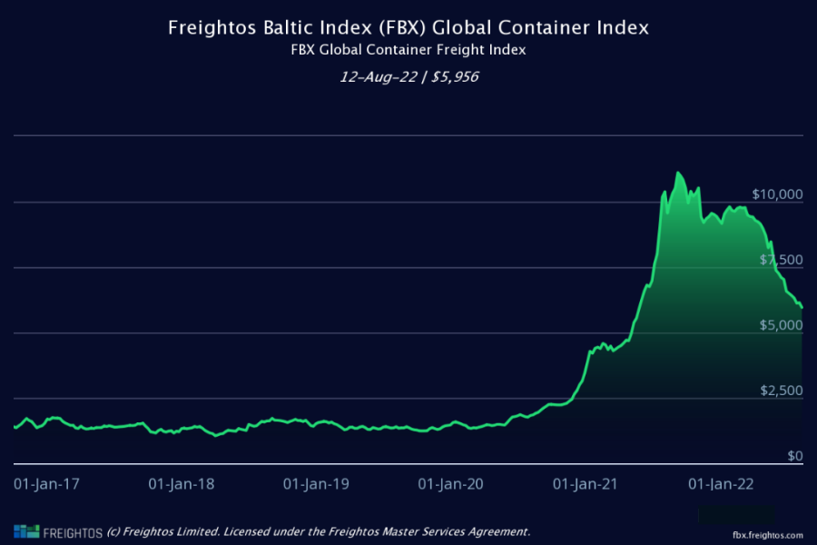 另一项货运承揽业常用的运价指标FBX(波罗的海货柜运价指数)亦然。从年初高点的每TEU(20呎标准货柜)9167美元,如今只剩每TEU 6343美元,修正幅度高30.8%。
