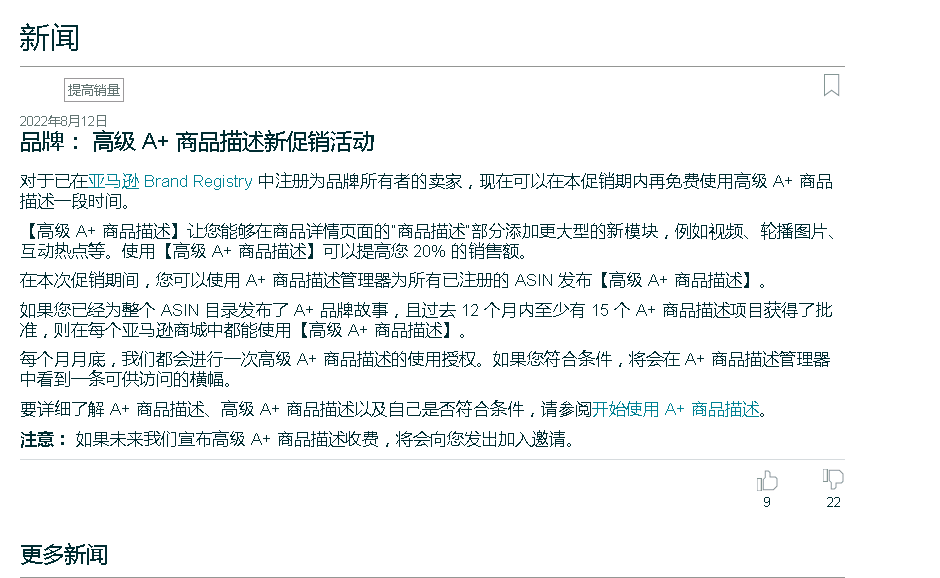 此前,亚马逊表示只有高级别账号和自营店铺,才能使用的高级A+的编辑权限功能。如今,亚马逊表示对所有符合条件的普通卖家,同步该项功能!