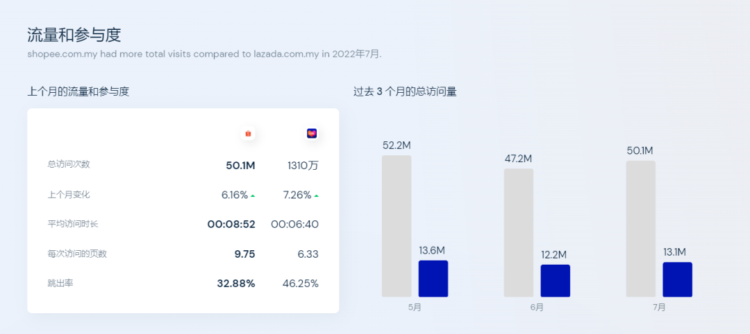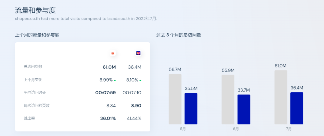 泰国Shopee访问量达6100W,增长8.99%,Lazada访问量达3640W,增长8.10%。