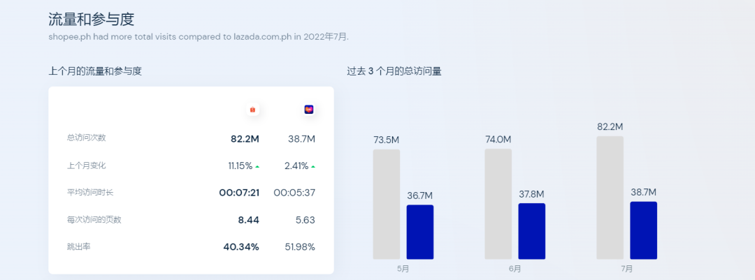 菲律宾Shopee访问量8220W,增长11.15%,Lazada访问量达3870W,增长2.41%。