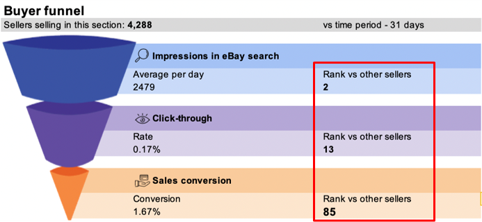 下面两幅图便是两个不同物品刊登的"listing quality report",左侧数据是卖家店铺中某一个类目的物品刊登在eBay平台上的曝光量、点击转化率和销售转化率,右侧红框中的是这些数据在同类卖家中所处的排名,排名越高说明在同类卖家中表现越好,也就可以优先选择进行广告投放。