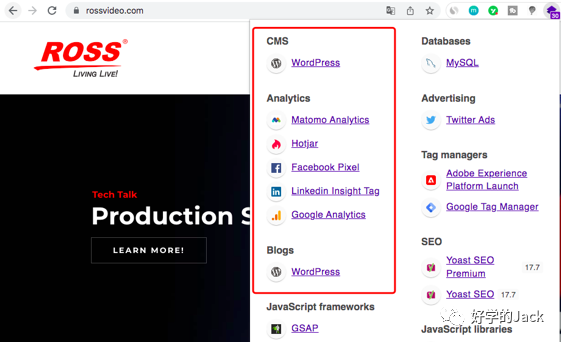 比如说这个客户用WordPress建站,用yoastseo插件,安装了谷歌分析插件,Facebook 像素,领英的Tag,Hotjar的热力图,营销这块还是蛮专业的。