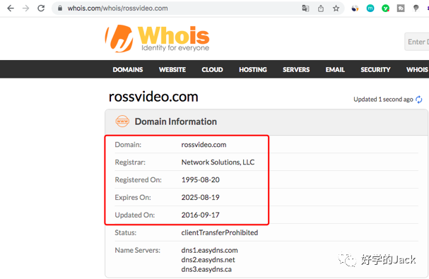可分析域名的历史变迁情况,域名注册人的电话/地址/邮箱等,可以看到对方域名年限,判断对方公司成立时间等。