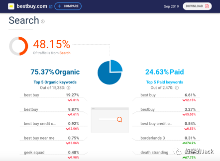 Search流量来源:SEO流量以及Adwords广告流量的总和。如果搜索流量高,说明你的竞争对手正在投Adwords广告或者在做SEO,可以使用Ahrefs或者SEMrush的工具来检测。