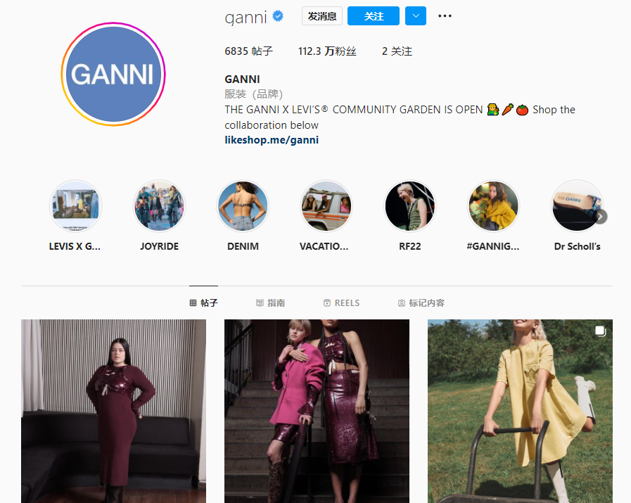 丹麦设计师品牌GANNI创立于2000年,2009年由Ditte Reffstrup与Nikolaj夫妻档接手后,将这个品牌从北欧小众推上街头时尚舞台。目前GANNI在Instagram上拥有112万名粉丝,是奢侈品电商网站Net-a-Porter最畅销的品牌之一。