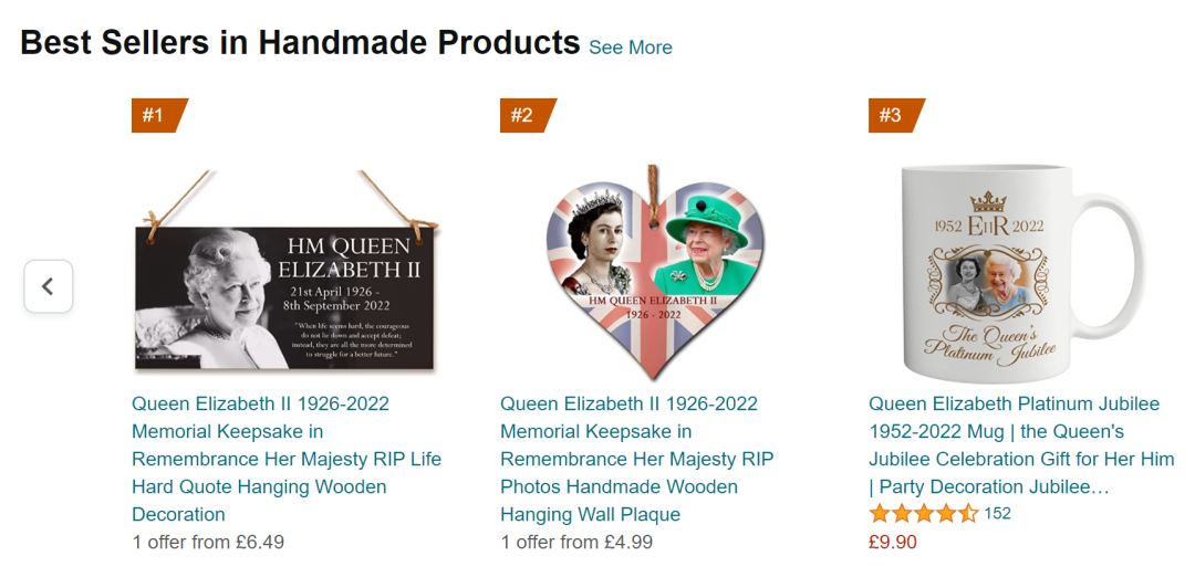 ▲图片来源于亚马逊英国站 值得注意的是,在这场王室周边消费热中,由于不断飙升的通货膨胀造成的生活费用压力,更多的英国消费者都选择了购买价格更低、体积较小的纪念商品。在手工制品畅销榜上,英国女王木牌匾、马克杯位列前三。 :https://www.ikjzd.com/articles/1569945221326553090