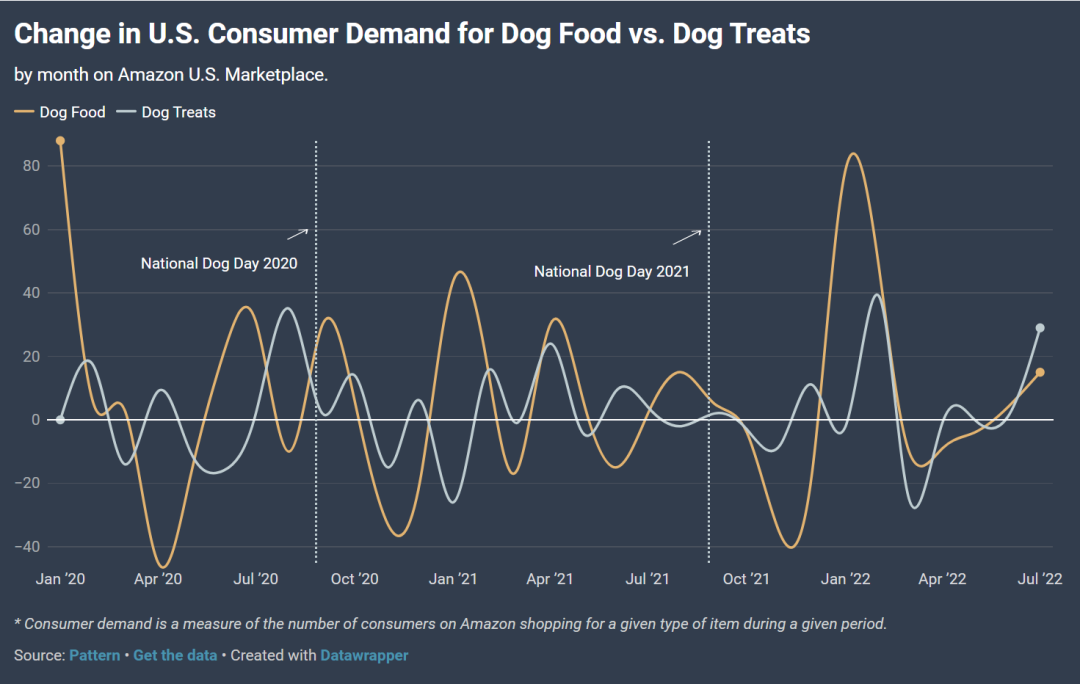 近日,Pattern分析了消费者对狗用品的需求如何在国家狗日前后发生变化: