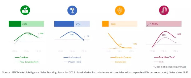 研究显示,消费者对能够轻松高效完成工作的智能化产品需求上升。例如非接触式设备,如运动传感器照明和电子水龙头,除了提供便利外,还具有卫生和环保的优势,这些都是新兴但高增长的市场。自2022年1月至6月,电子水龙头的销售价值同比增长18%,而普通水龙头则为11%。