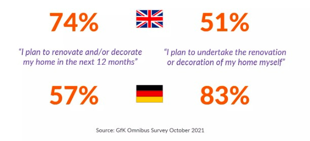 2022年上半年,通货膨胀在美国、德国和英国达到了40年以来的高点,严重打击了消费者信心。但据GFK研究,家装和园艺市场的需求持续存在,今年上半年的整体销售价值高于2019年同期。