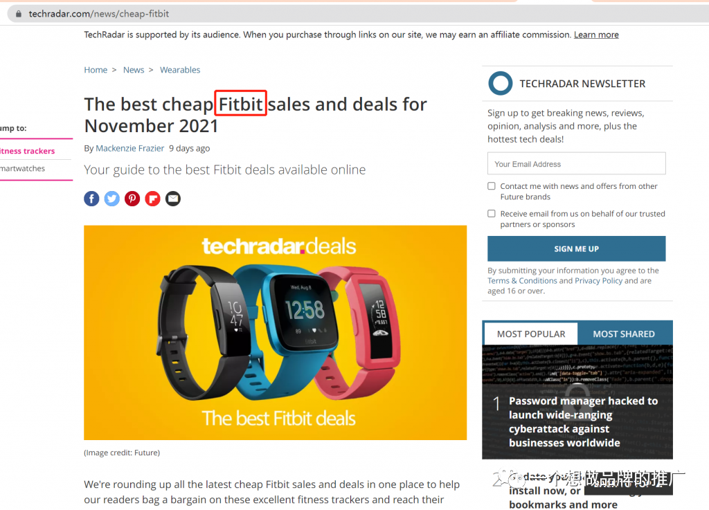 下图是智能穿戴知名品牌- Fitbit 的智能手环在顶级科技网站Techradar上面对今年亚马逊黑五的一个促销帖子。