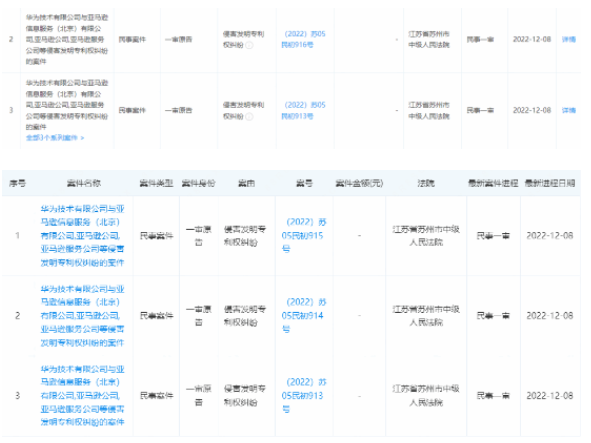 ICC讯 近日,华为技术有限公司新增开庭公告,案由为侵害发明专利权纠纷,被告为亚马逊公司、亚马逊服务公司、亚马逊信息服务(北京)有限公司、仁宝电脑工业股份有限公司、仁宝电子科技(昆山)有限公司等,案件将于 12 月 8 日在江苏省苏州市中级人民法院开庭。