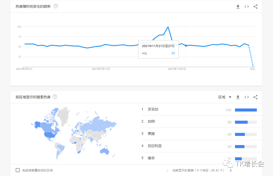 我们也可以从谷歌趋势上看到,海外用户对于假发关键词的搜索量基本保持在一个稳定的水平线上,并在21年年底迅速上升。