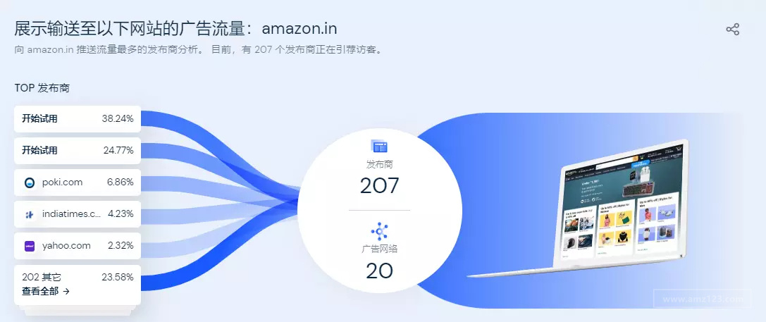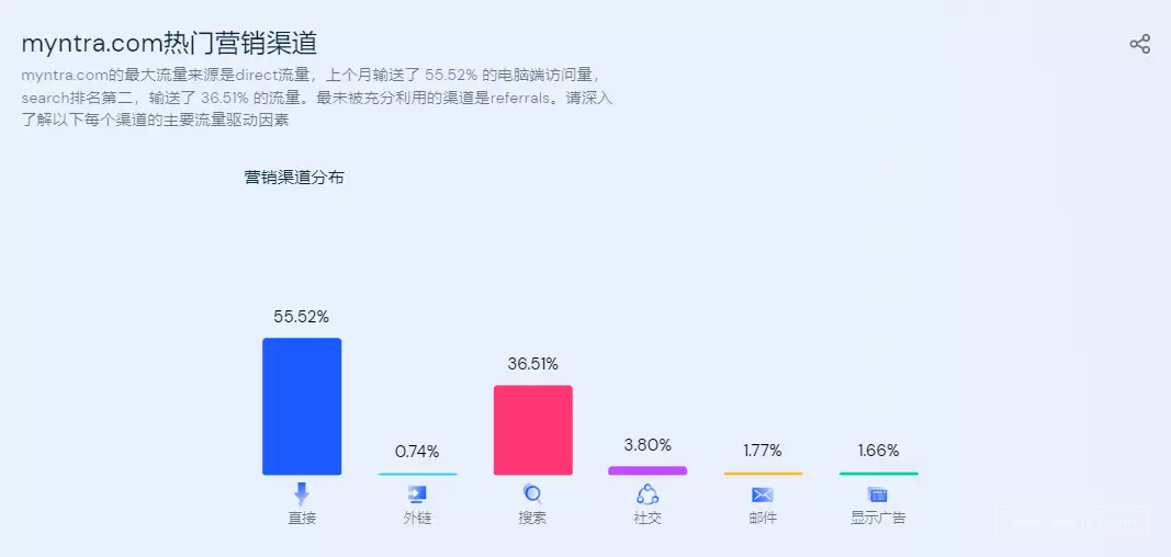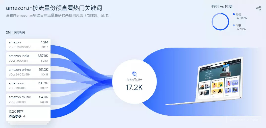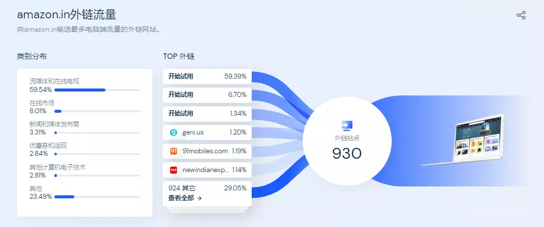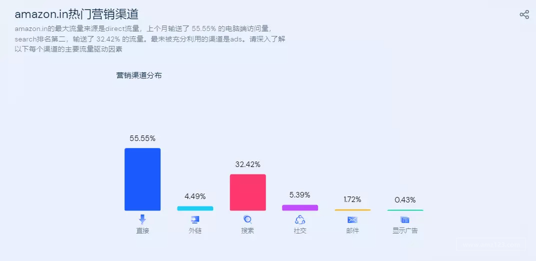 amazonin接收的流量来自direct (55.51%) 和search (32.39%),尚未充分利用的渠道是"ads"(PC 端,全球范围)。