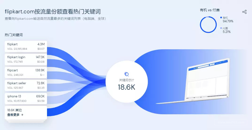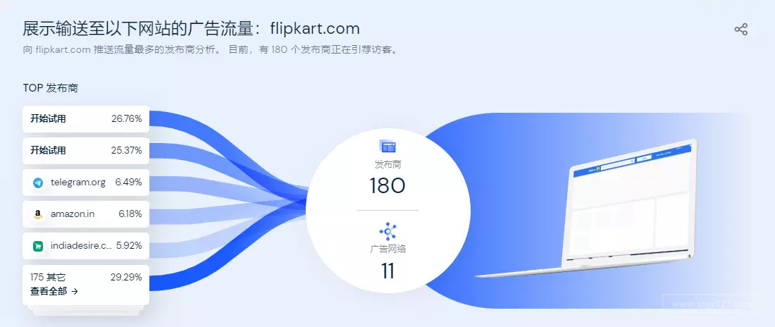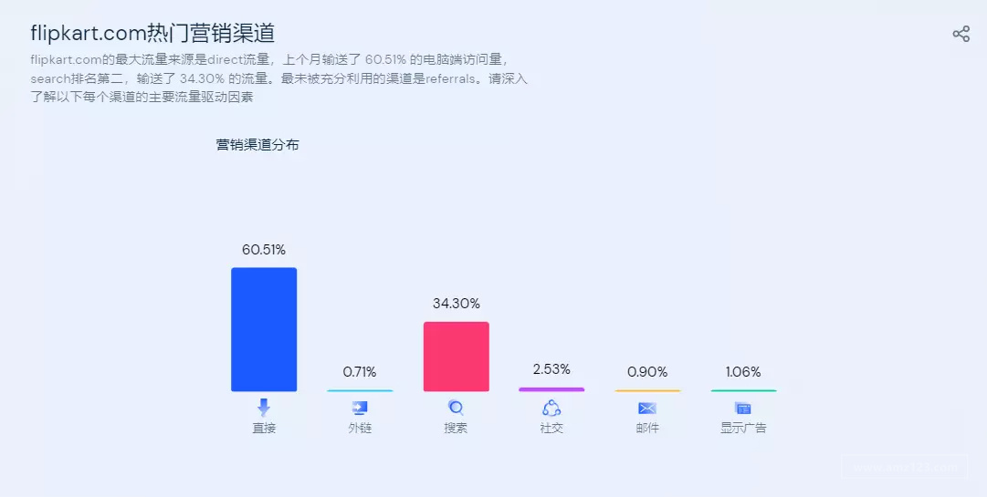 flipkart.com接收的流量来自direct (60.51%) 和search (34.30%),尚未充分利用的渠道是"referrals"(PC 端,全球范围)。