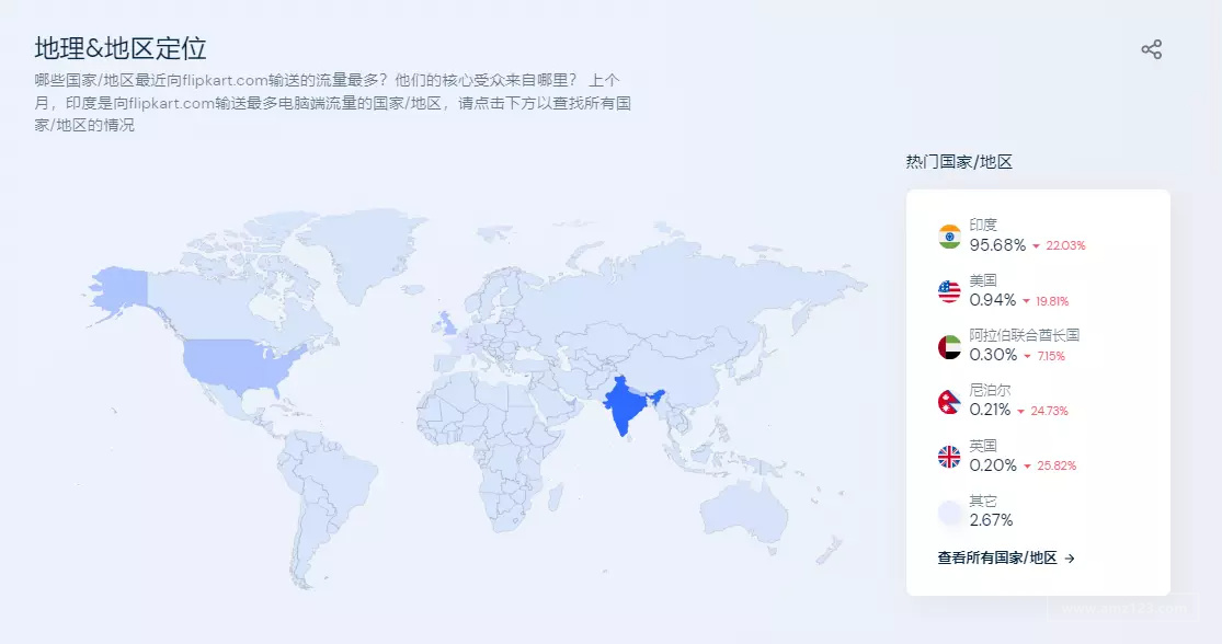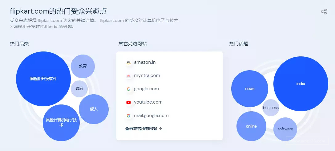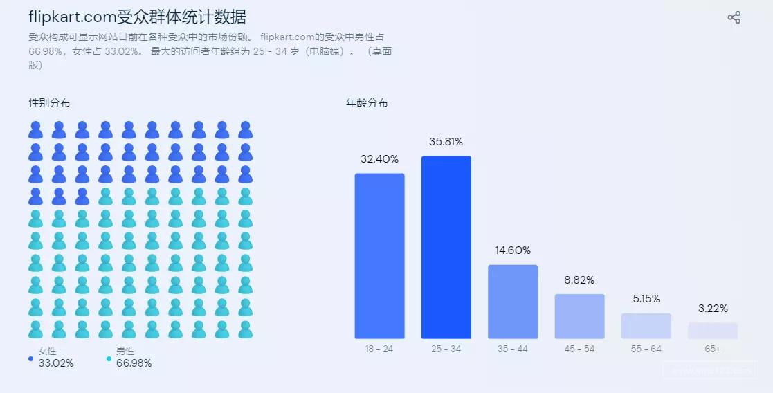 flipkart.com的受众中,男性占66.98%,女性占33.02%。最大的访问群体是年龄在25-34岁岁的人(PC端)。