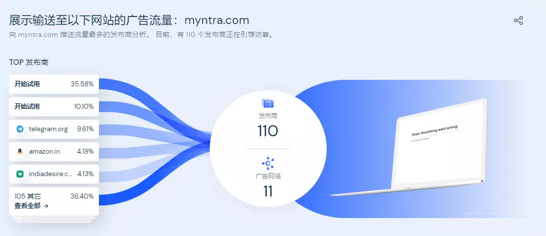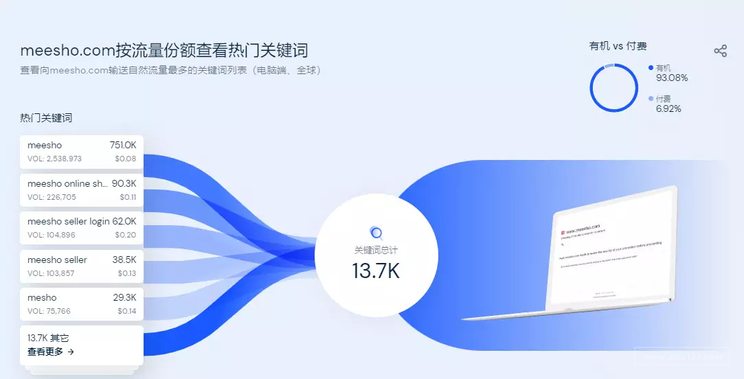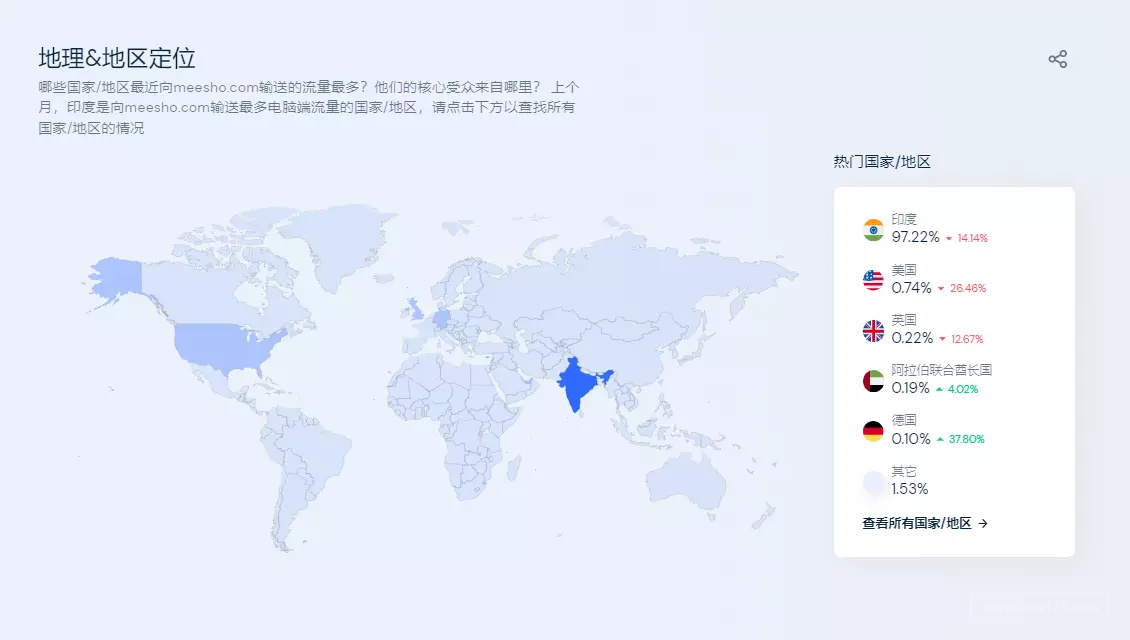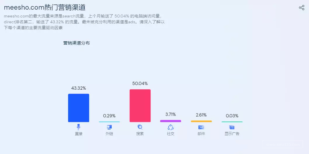 meesho.com接收的流量来自search (50.04%) 和direct(43.32%),尚未充分利用的渠道是"ads"(PC 端,全球范围)。
