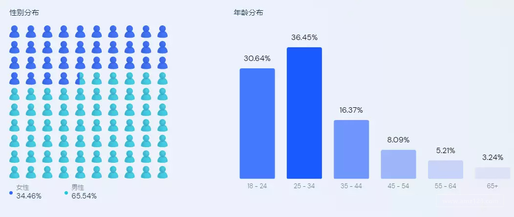 amazon.in的受众中,男性占64.49%,女性占35.51%。最大的访问群体是年龄在18-24岁的人(PC端)。